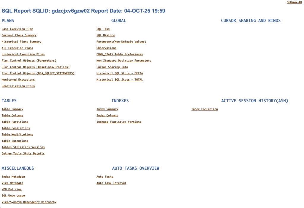 Ebenfalls mit dem RU auf 19.28 steht der SQL Diagnostic Report zur Verfügung. Im Package DBMS_SQLDIAG gibt es eine neue Funktion mit dem Namen REPORT_SQL. Diese Funktion liefert alle relevanten Informationen zu einem SQL-Statement, gesammelt in einem CLOB, das ein HTML File mit allen Infos enthält.